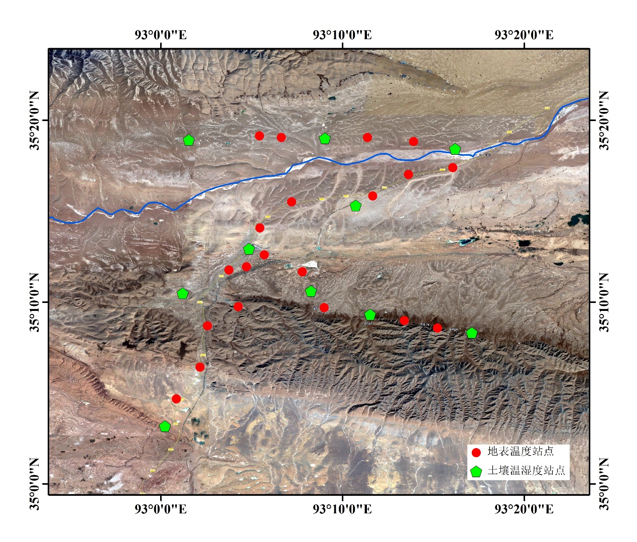 隨著全球氣候變暖的加劇,可可西里地區多年凍土退化日益嚴重,本次科考任務是在沿青藏公路五道梁段,選擇代表性地點埋設土壤溫濕度測量儀器,并在地表設置數據采集傳輸設備,以構建長期監測網絡系統,進一步加深對可可西里地區多年凍土未來變化的認識。五道梁地區位于高原連續多年凍土區,青藏高原冰凍圈觀測研究站在五道梁布設有多年凍土綜合觀測場并在過去三十年間已開展大量多年凍土相關研究。在此基礎上,該監測網絡的布設主要針對微波遙感產品(地表土壤水分和凍融過程等)的地面驗證及其降尺度研究,以及多年凍土區活動層水熱特性、空間分異規律及變化模擬研究。最終,科考隊在以五道梁氣象站為中心的約20 km半徑范圍內共布設了10套土壤溫濕度監測儀器,監測點總體呈“一縱兩橫”形式:一縱為青藏公路沿線(楚瑪爾河大橋至紅梁河段)、兩橫分別沿楚瑪爾河北岸和白馬山(據當地人翻譯)北麓展開,俯視整個監測網絡分布仿佛呈字母“π”的形狀。監測點平均海拔4613.8m,最高海拔4719m。